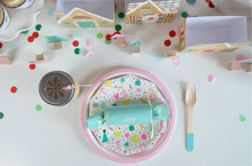 Another DIY we did for this party was making our own party crackers. This was a super fun, easy, and cheap way to create party favors that doubled as place settings. You can see how we made them here.