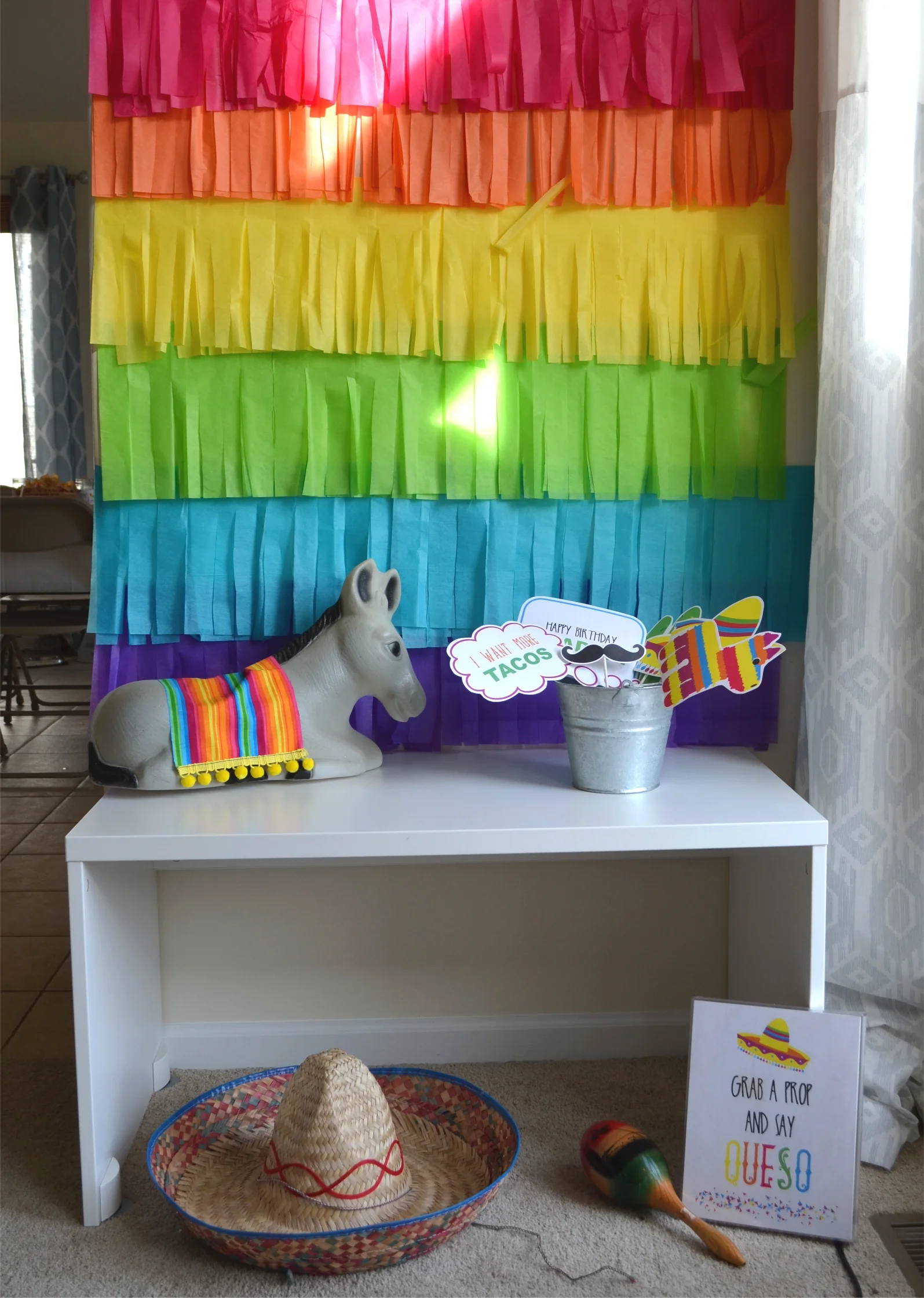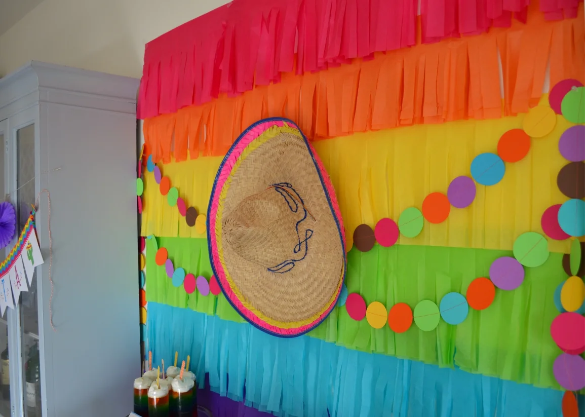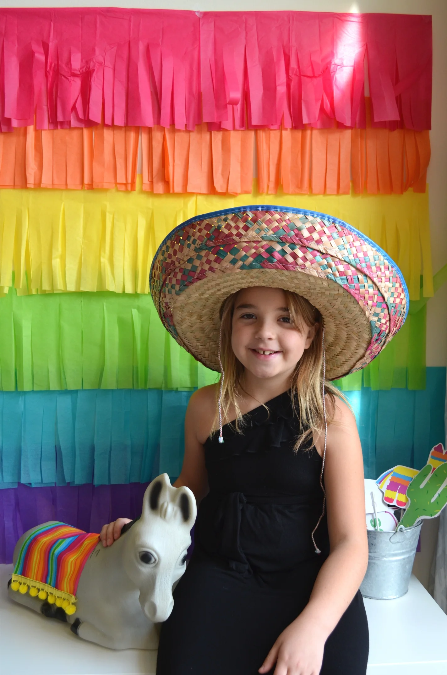 I knew right away that I wanted a playful color pallet, so I took colors straight from a typical pinata. To add more fun to the invitations, I sewed on crepe paper to the bottom to give it more of a pinata feel. The invitations set the stage for the rest of the party.